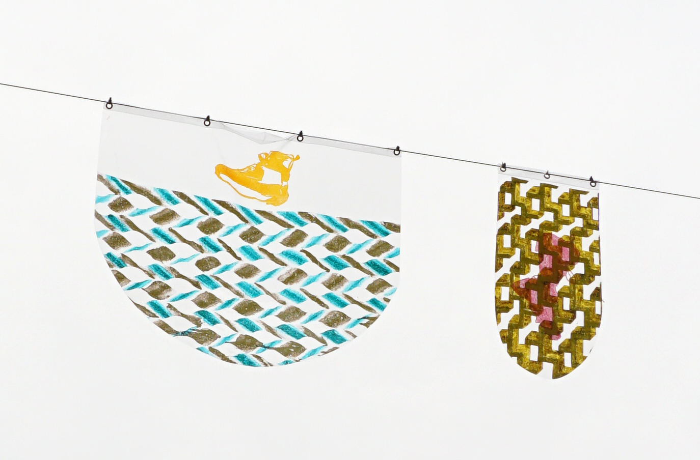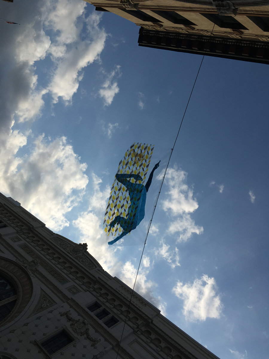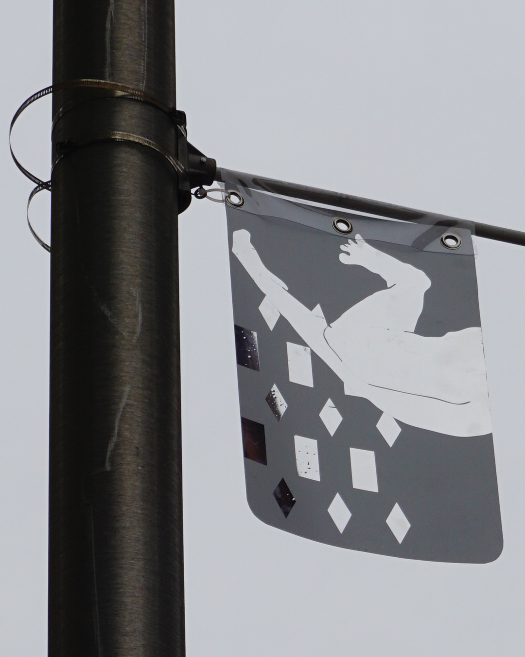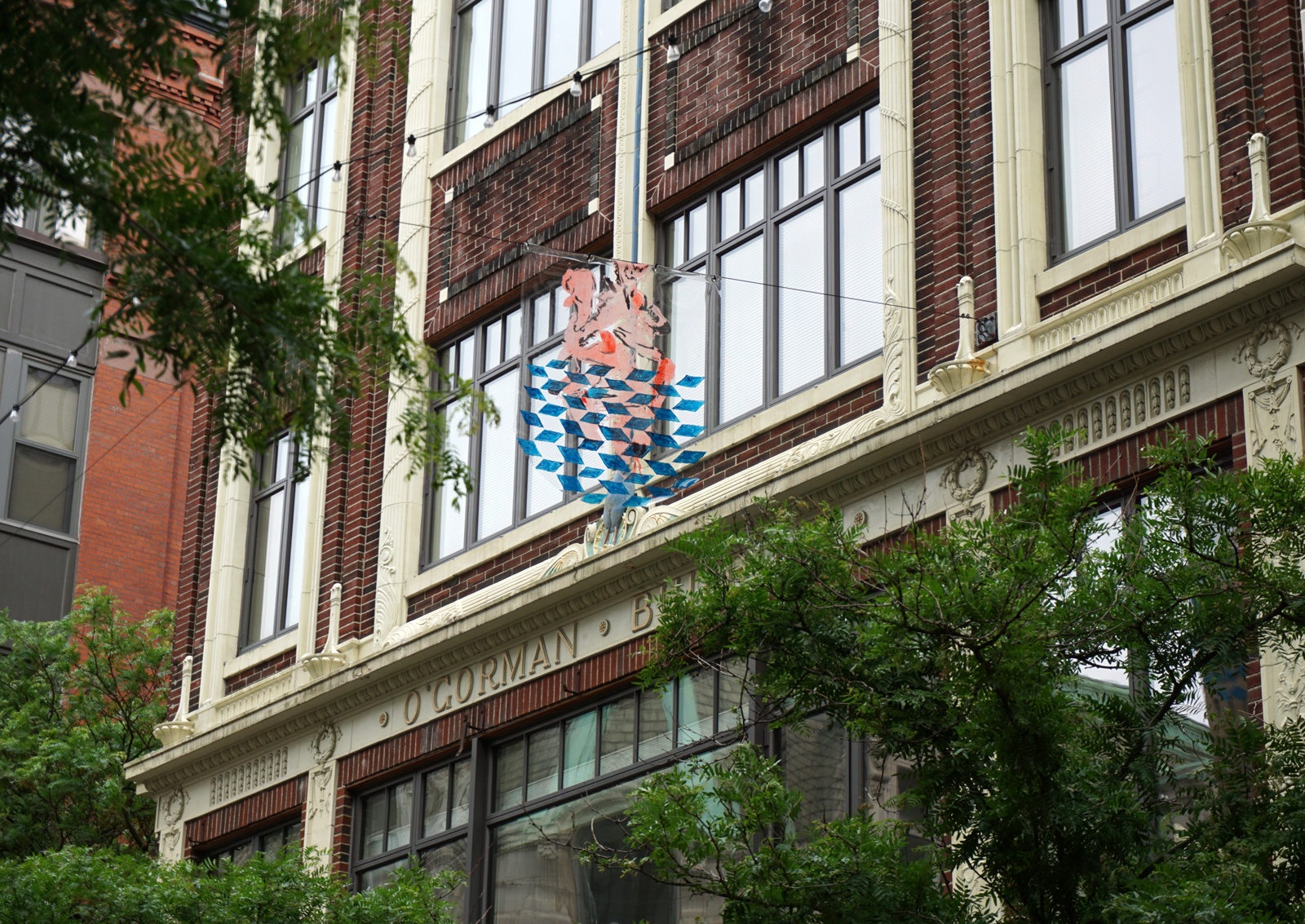 Shadow Farming was a collaboration with KYLE b. co., commissioned by the Providence Department of Arts, Culture + Tourism for PVD Fest 2018. It consisted of 31 unique pieces — 20 oil-on-vinyl monoprints and 11 vinyl-on-etched-aluminum panels — attached to wires and streetlight poles across five blocks of downtown Providence, RI.
